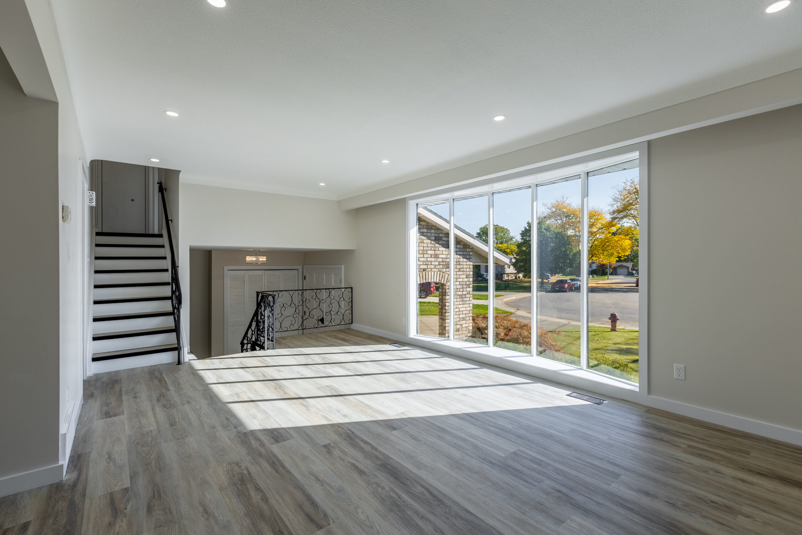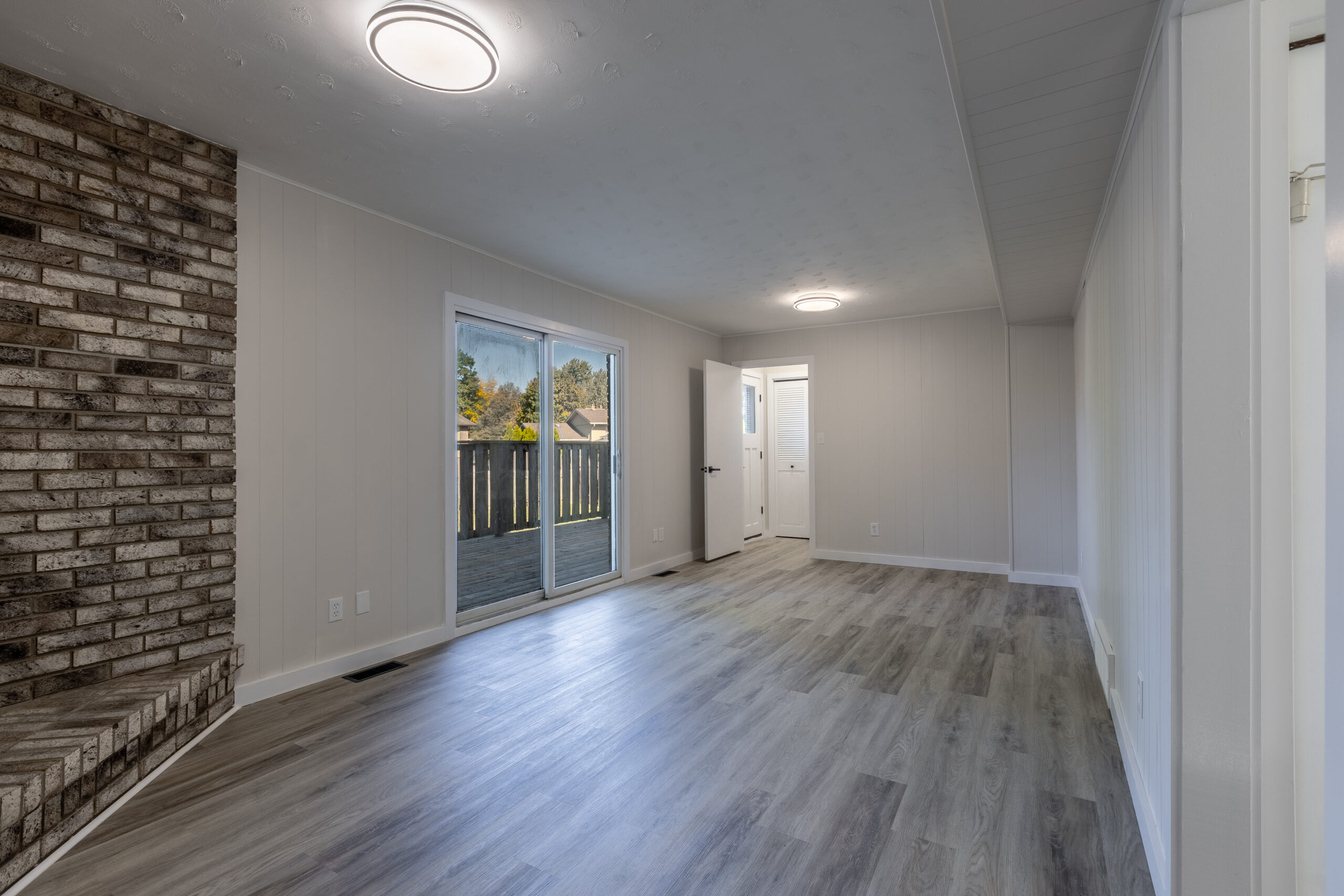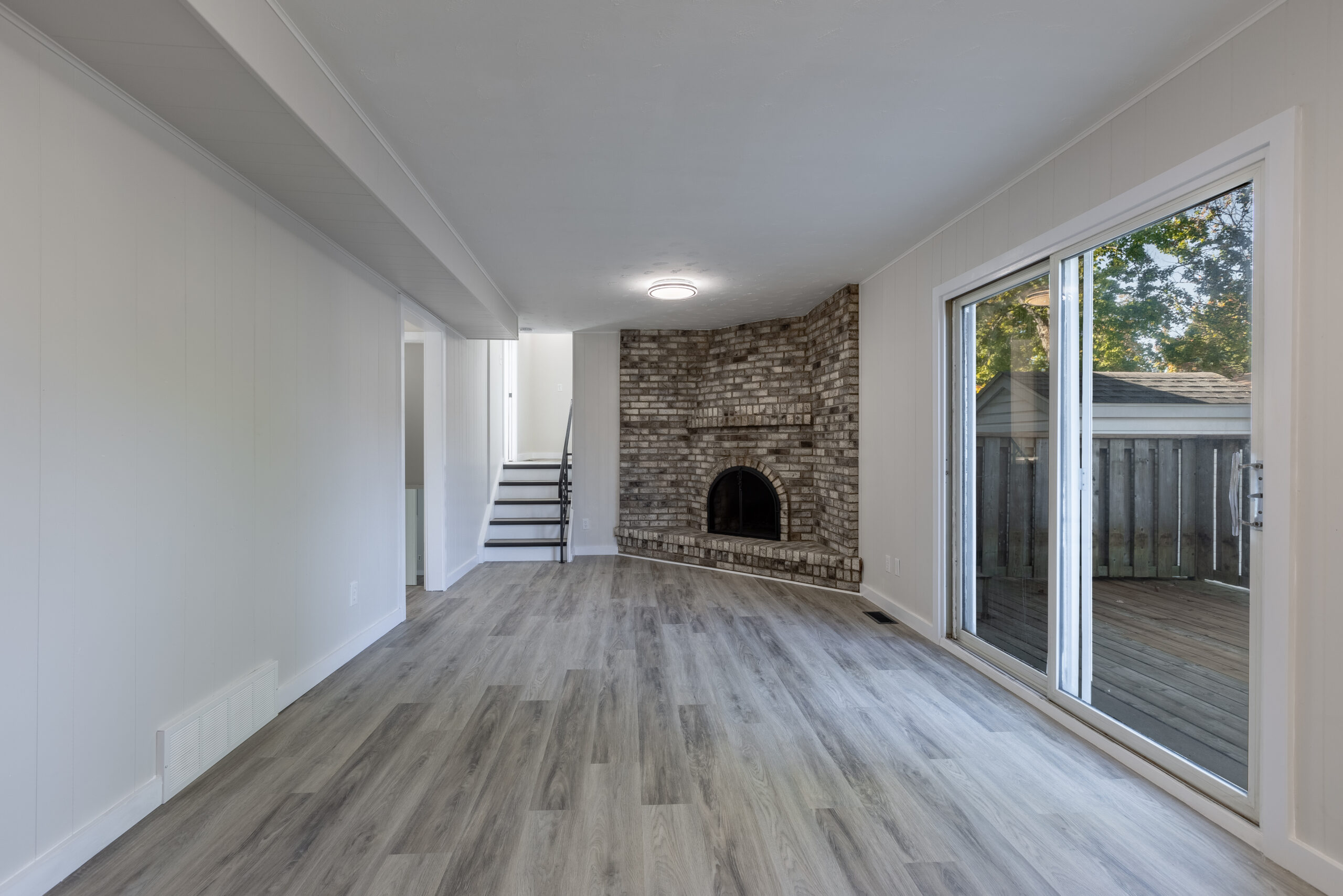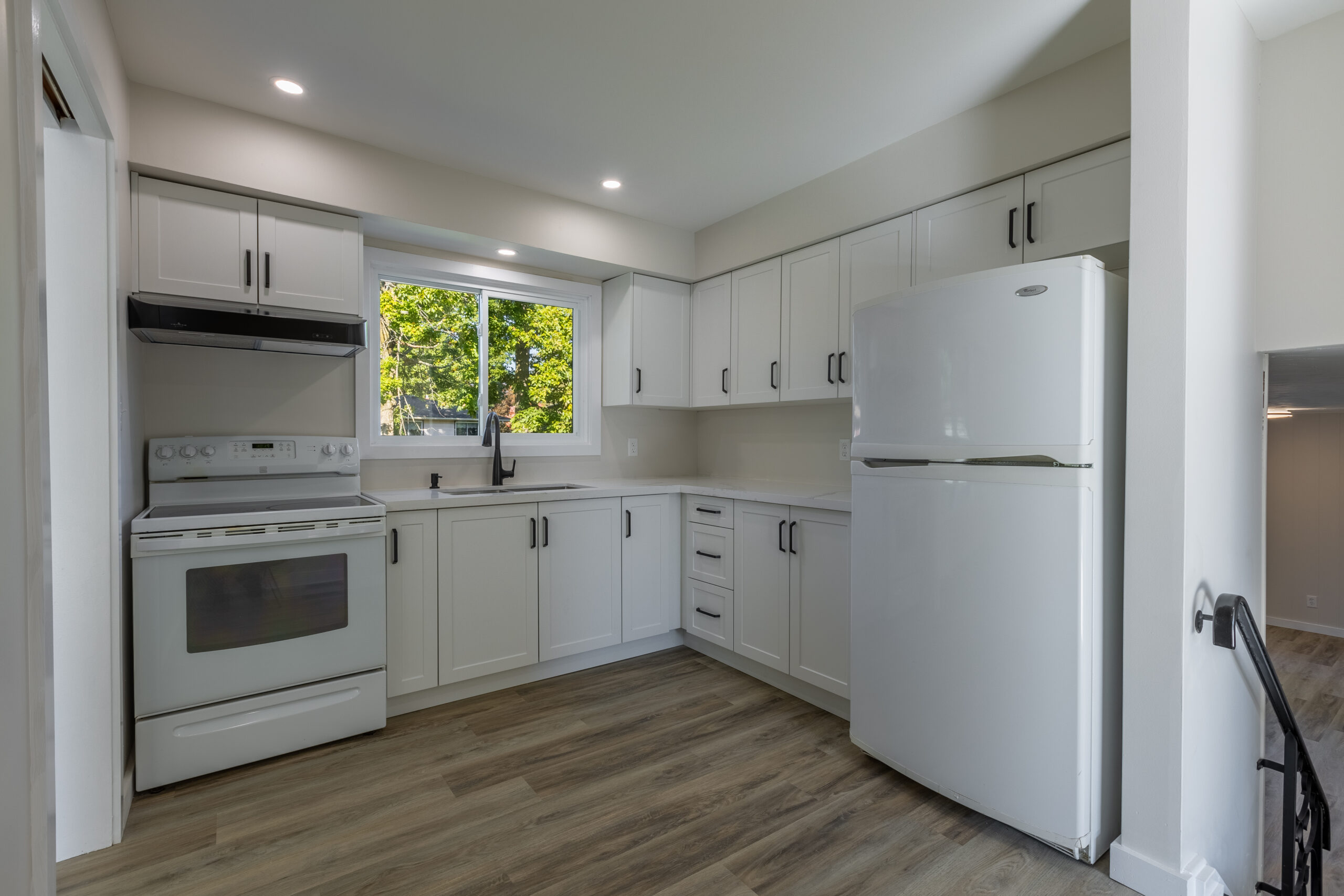 A sun-filled front living room with a charming bow window greets guests, while a spacious family room at the back opens onto a private deck — ideal for summer barbecues or peaceful evenings outdoors. The bright white kitchen features quartz countertops and updated vinyl plank flooring that flows throughout the home.