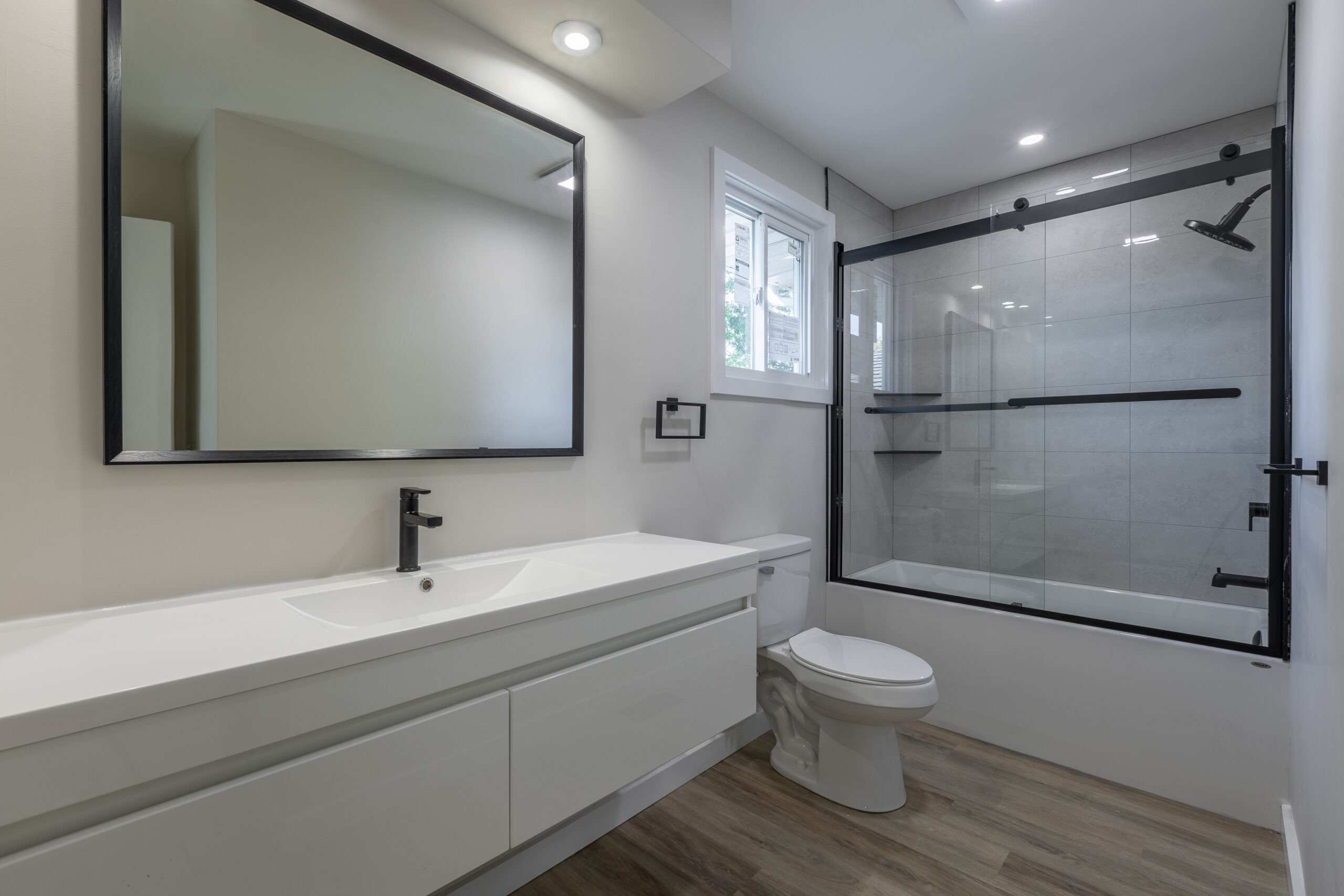 The main bathroom showcases a luxury glass shower, floating vanity, and modern finishes. The fully finished lower level extends your living space with a rec room, bedroom, office, 3-piece bath, and built-in sauna.