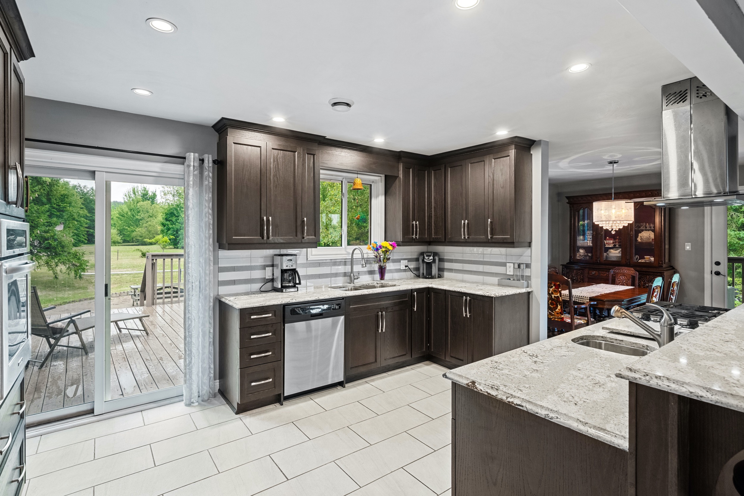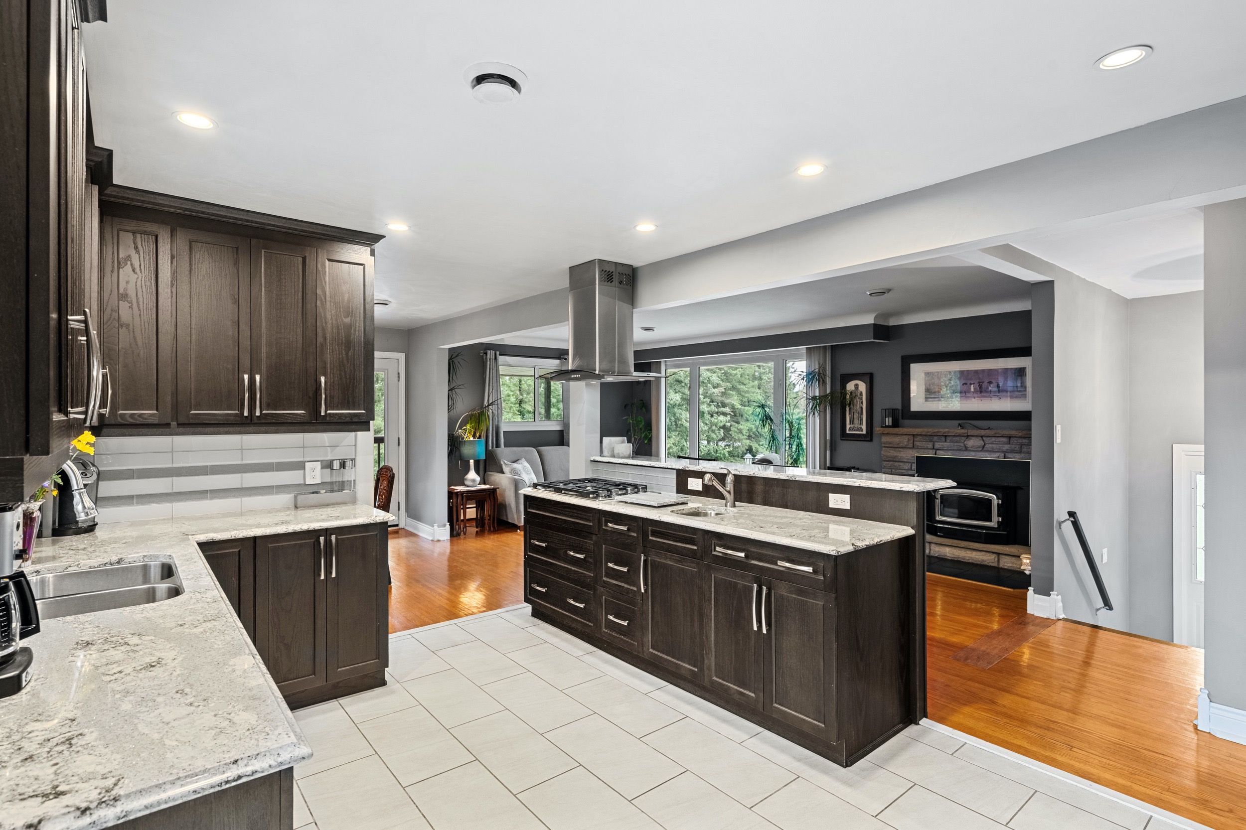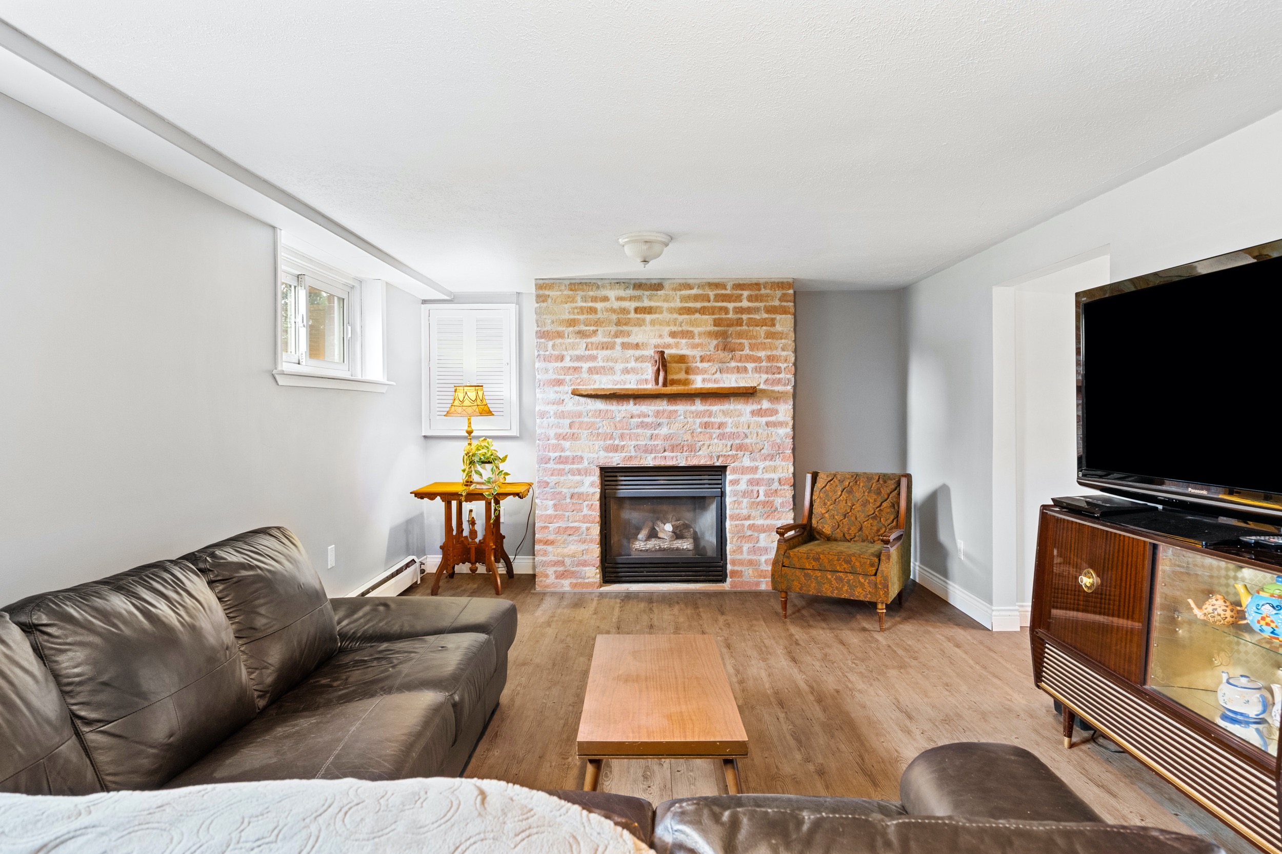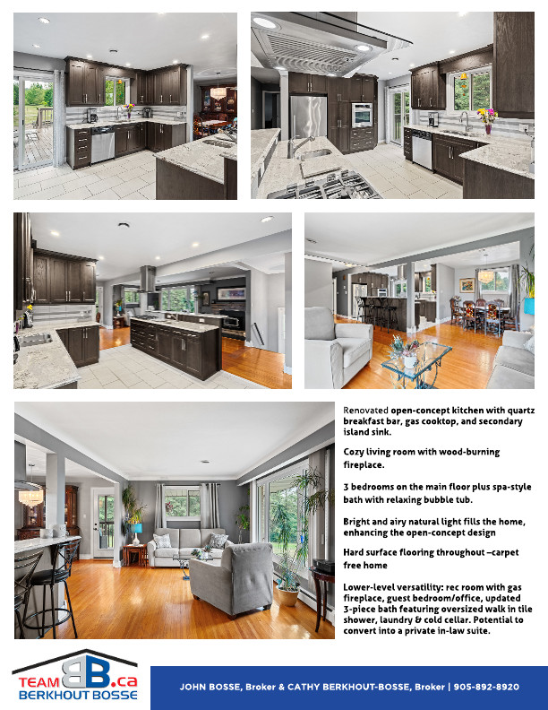 At the heart of the home, a fully renovated modern kitchen showcases sleek quartz countertops, a large island with breakfast bar, gas cooktop, and secondary sink — perfect for both everyday living and entertaining. The kitchen opens to a bright, inviting living room with a wood-burning fireplace, creating a warm and welcoming atmosphere. The finished lower level offers a spacious L-shaped recreation room with gas fireplace, an updated three-piece bath, laundry, cold cellar, and a flexible area ideal for a guest bedroom, office, or potential in-law suite.