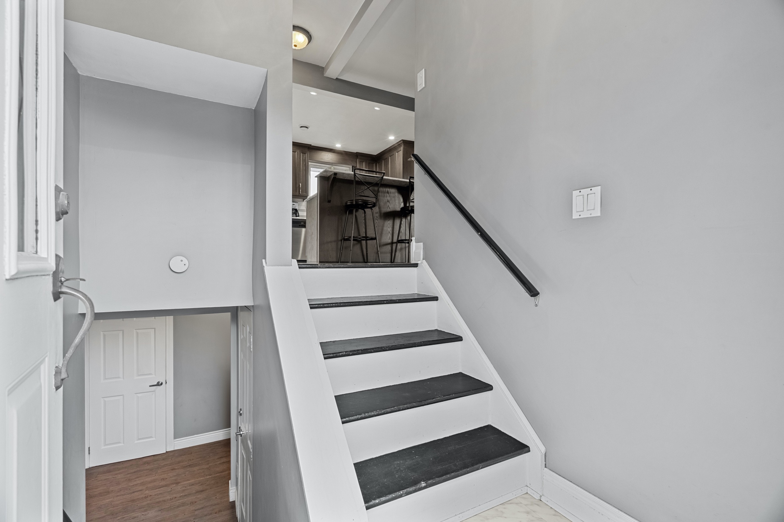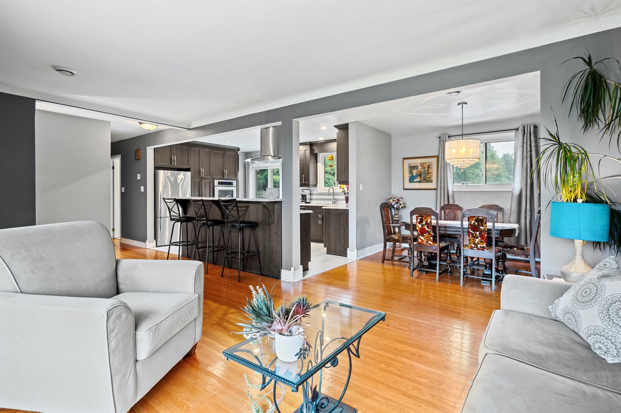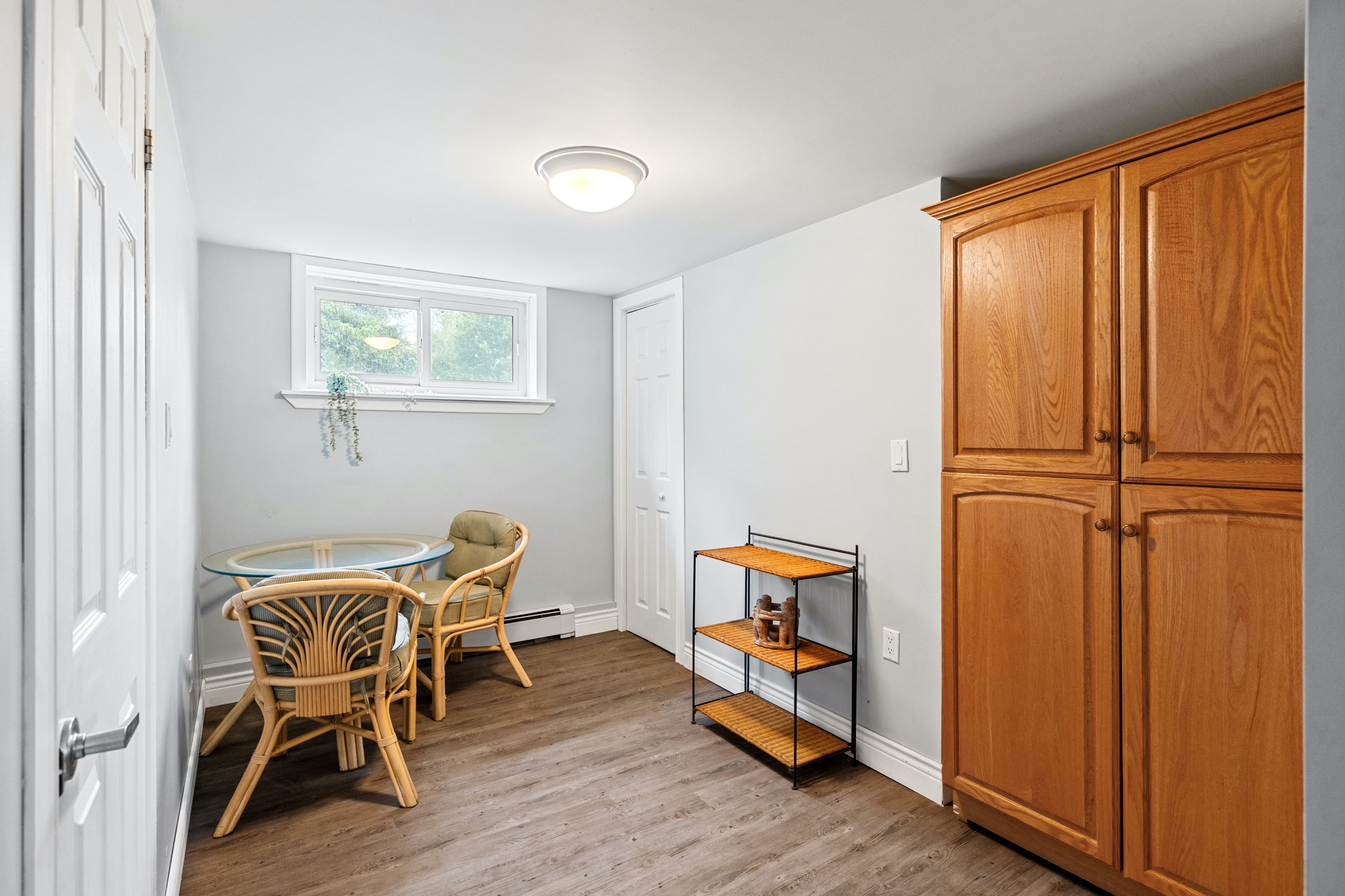 At the heart of the home, a fully renovated modern kitchen showcases sleek quartz countertops, a large island with breakfast bar, gas cooktop, and secondary sink — perfect for both everyday living and entertaining. The kitchen opens to a bright, inviting living room with a wood-burning fireplace, creating a warm and welcoming atmosphere. The finished lower level offers a spacious L-shaped recreation room with gas fireplace, an updated three-piece bath, laundry, cold cellar, and a flexible area ideal for a guest bedroom, office, or potential in-law suite.